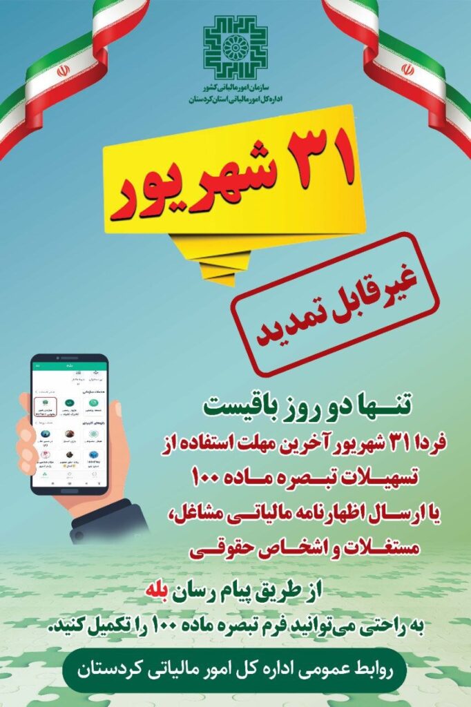 سپتامبر 22, 2025 سپتامبر 22, 2025۳۱ شهریور؛ آخرین مهلت غیرقابل تمدید برای تسلیم اظهارنامه و بهرهمندی از تبصره ماده ۱۰۰خبرگزاری خبرآنلاین از سنندج گزارش داد، مصطفی فعلهگری با اشاره به تأکیدات قبلی در اطلاعیهها و اخبار رسمی اعلام کرد: سقف بهرهمندی از تسهیلات […]